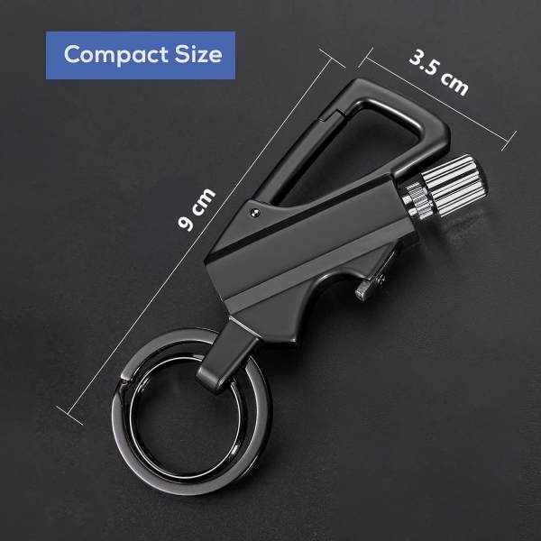 Združuje tri bistvene funkcije v enem orodju: trajni vžigalnik, odpirač za steklenice in karabin za ključe, vse v trpežnem in kompaktnem ohišju.