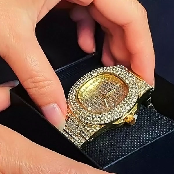 Na tisoče lesketajočih se kristalov spremeni uro v privlačno pozornost. To ni samo ura – je drzen izraz razkošja in elegance.