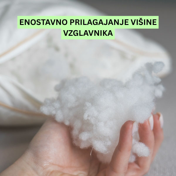 Notranja obloga vsebuje bambusova vlakna, ki naravno absorbirajo vlago in ohranjajo vzglavnik higienski. Polnilo iz visokokakovostnih mikrovlaken nudi nežno podporo za dolgotrajno udobje.