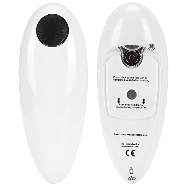 Samo pritisnite gumb, da hitro in varno odprete pločevinke različnih velikosti. Popoln za vsakogar, tudi za ljudi z artritisom, revmatizmom ali drugimi bolečinami v rokah.