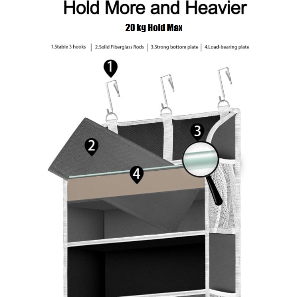 Opremljen z 3 nastavljivimi kovinskimi kljukami, ta organizator se enostavno prilega vratom do debeline 4 cm.